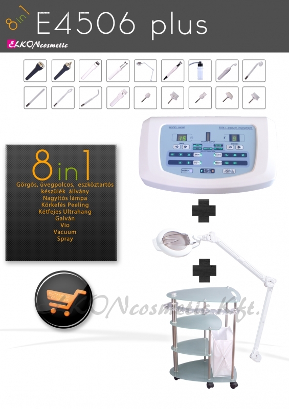 PRÉMIUM MINŐSÉG! H4506 TIPUSÚ DIGITÁLIS KÉSZÜLÉK: VACUUM+ SPRAY+ VIO+ PEELING+ IONTO (GALVAN) FUNCIÓKKAL, KIEGÉSZÍTVE GÖRGŐS, ÜVEGPOLCOS, ESZKÖZTARTÓS KÉSZÜLÉKÁLLVÁNNYAL ÉS NAGYÍTÓS LÁMPÁVAL.