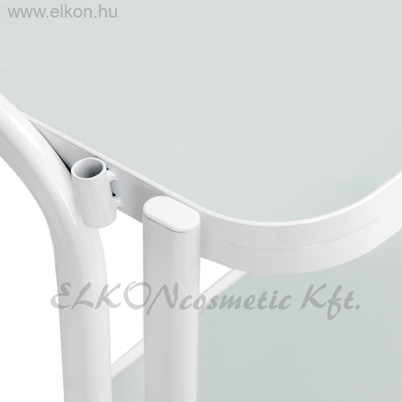Az alumíniumból készült, fehér árnyalatú váz könnyed, ugyanakkor masszív tartást biztosít, így ideális választás a napi használathoz. Az asztal minimalista stílusa és átlátszó üvegpolcai letisztult, professzionális megjelenést kölcsönöznek bármelyik kozmetikai helyiségnek.