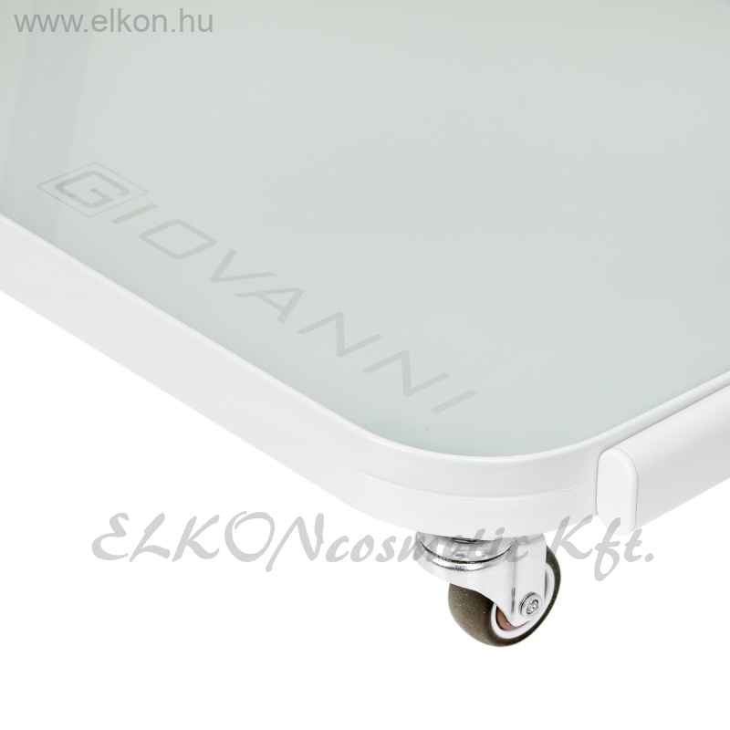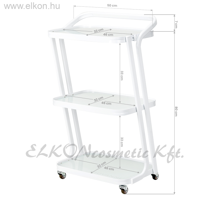 Ez a kompakt, mégis stabil kialakítású asztal három edzett üvegpolccal rendelkezik, amelyek ideálisak kozmetikumok, kezelőeszközök és kiegészítők átlátható és könnyen hozzáférhető tárolására.